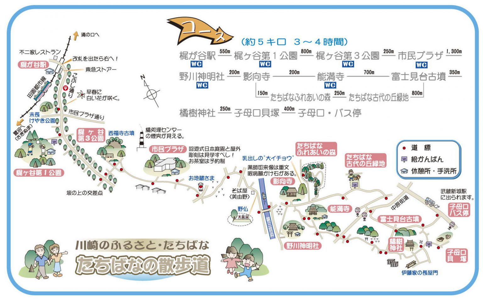 影向寺をはじめ、川崎の歴史・文化の発祥の地ともいえるたちばなに現存する縄文時代の遺跡子母口貝塚、 日本武尊と弟橘媛の伝説の伝わる橘樹神社、回遊式日本庭園のある市民プラザ、たちばな古代の丘緑地など がコースにあります。